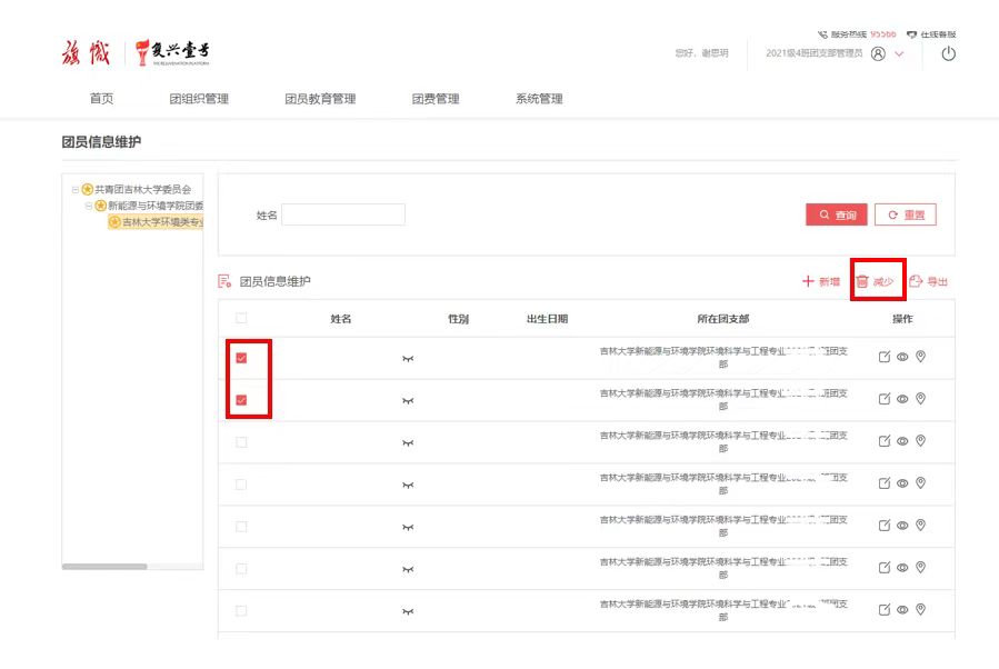 ②团支书登录网页版“复兴壹号”将其信息删除,具体操作流程:登录管理员账号-团员教育管理-团员信息维护-选中转专业学生-减少。